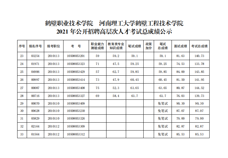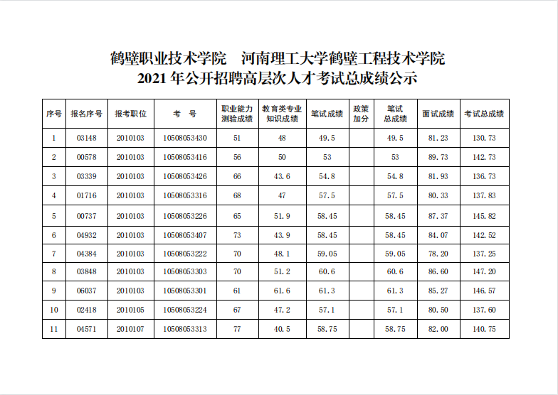 根據《老金沙9170登录 河南理工大學鶴壁工程技術學院2021年公開招聘高層次人才簡章》要求,現将老金沙9170登录河南理工大學鶴壁工程技術學院2021年公開招聘高層次人才考試總成績公示如下: